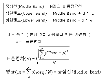 주가의 변동에 따라 상하밴드의 폭이 같이 움직이게하여 주가의 움직임을 밴드 내에서 판단하고자 고안된 주가지표를 말한다